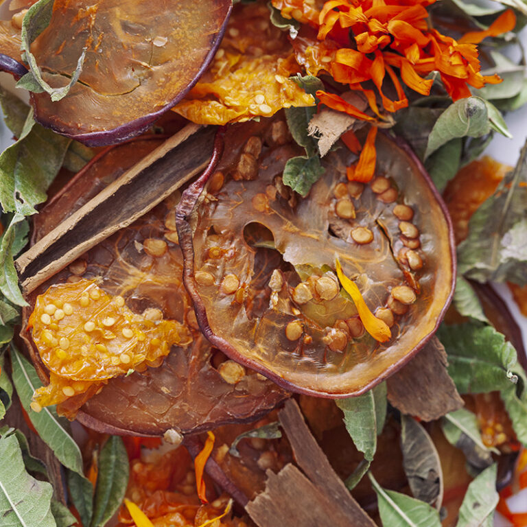 Solsticio de verano (caléndula en flor, tomate de árbol, uvilla, cedrón)